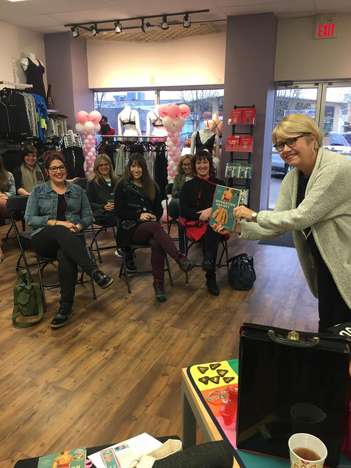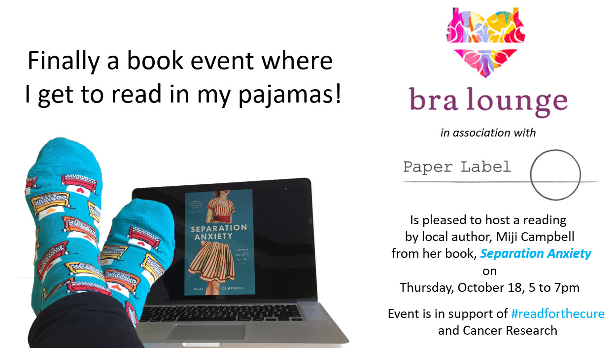 Separation Anxiety has been to bookstores, bars, and bistros but this is its first bra store. (First bra -- now there's a story.)