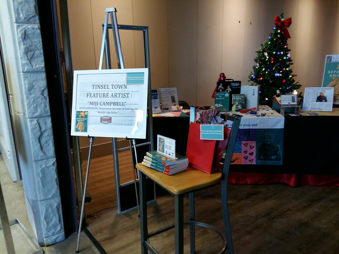 My "Featured Artist" location at the market's north entrance shared space with a coffee station/seating area. I was the first vendor to greet shoppers as they strode purposefully towards the main concourse seeking market-fresh ingredients for Christmas dinner. Most didn't have time to stop on the way in, but once their shopping was done, many of these same folks had time to put down their brimful carrier bags for a chat in the coffee area. It was a chance to remind people that books are the perfect last-minute gift! (Along with chocolate, coffee, wine — and so many things at this festive market!)
