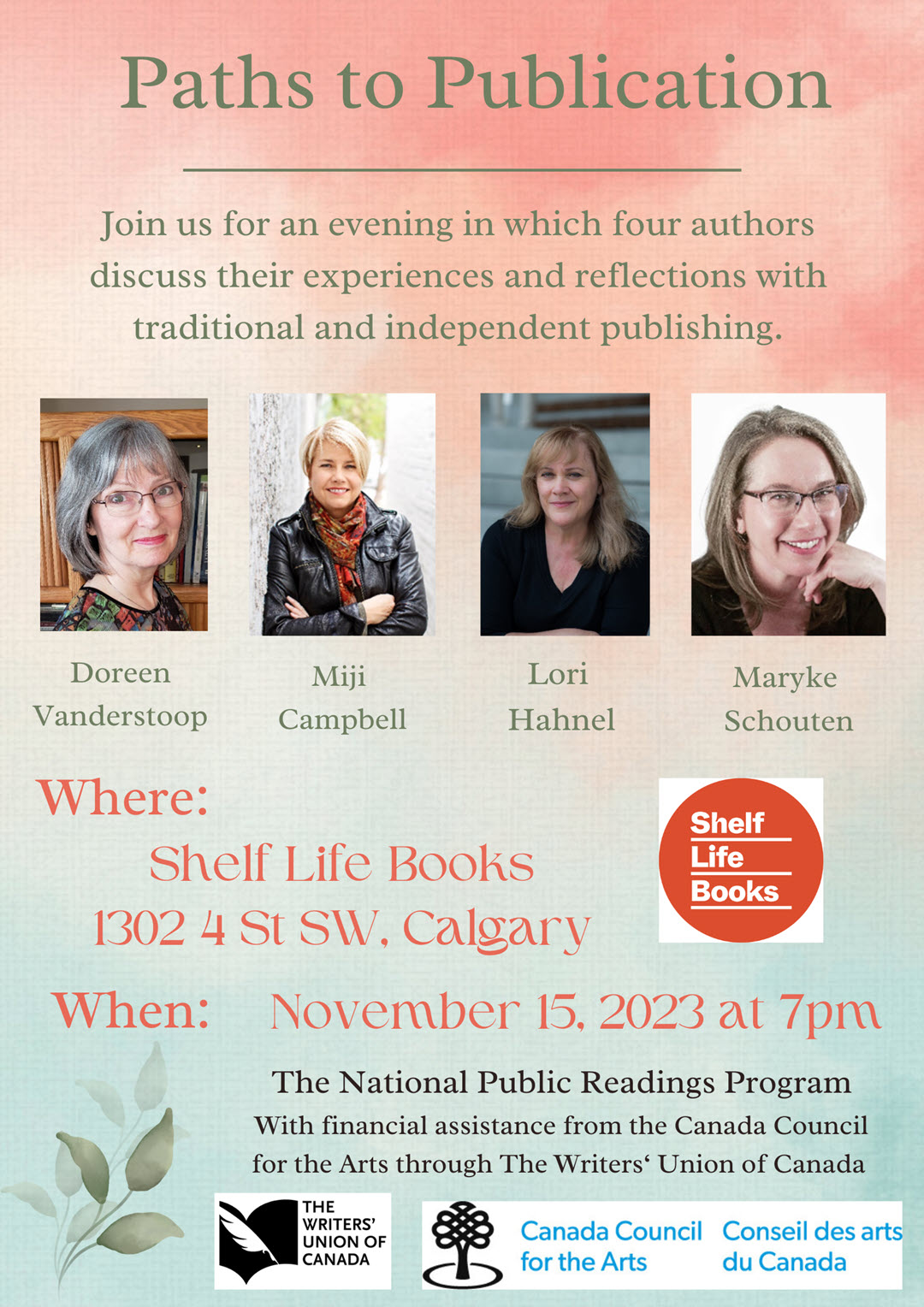It’s a long and winding road that leads from manuscript to book. I’ll be sharing my adventure with authors Doreen Vanderstoop, Lori Hahnel and Maryke Schouten at Shelf Life Books in Calgary on Wednesday, November 15 at 7pm. Please join us!